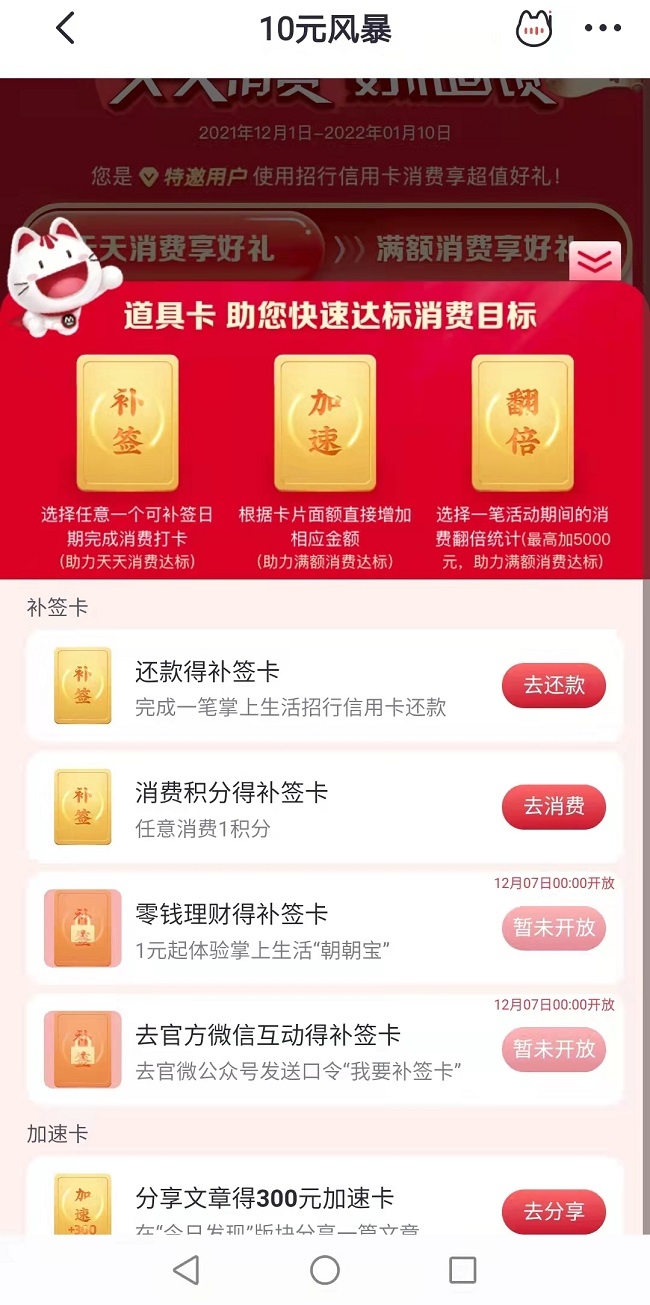 为帮助客户更快达成目标,今年“10元风暴”推出各种“道具卡”,如补签卡、加速卡、翻倍卡,持卡人只需完成特定任务即可领取相应卡片,如完成一笔掌上生活招行信用卡还款、在掌上生活App“今日发现”版块分享一篇文章、在掌上生活体验活期理财“朝朝宝”满1元等。这些“道具卡”任务既给到客户一个了解掌上生活App的窗口,也让客户在完成各“道具卡”任务的过程中,像开盲盒一样体验了掌上生活的各类业务。