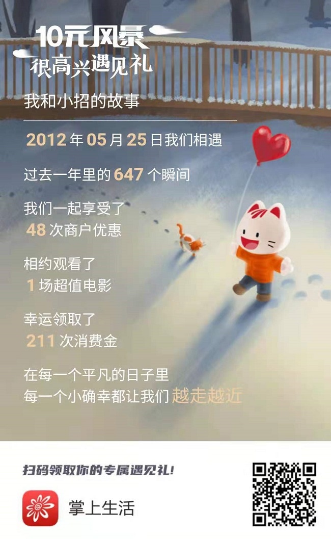 首先是“遇见礼”,活动期间登录掌上生活App即可获得一份“很高兴遇见礼”,100%有奖,奖品包含最高2022元消费金、最高88元商城券、饭票影票抵用券、话费充值券等。与此同时,持卡人能收获在过去一年中,自己与招行信用卡相遇、相伴、相助的故事。
