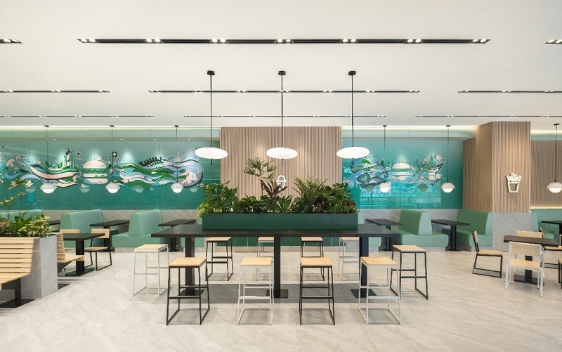 Shake Shack广州首店整体风格通透且灵动。店内摆放着丰富的绿植,金属色调和郁郁葱葱的绿色植物混合,给人一种亲近自然又不失时尚的舒适感。受广州天环“双鱼”外型的启发,门店设计结合了双鱼的流线型形状,采用大弧形设计,店内外的景色一览无余。店内结合了“双鱼”鱼鳞的渐变颜色,摆放了大面积的渐变玻璃墙。Shake Shack营造了室内外和谐的平衡感,为前来品尝的堡贝们打造愉快轻松的聚会场景。