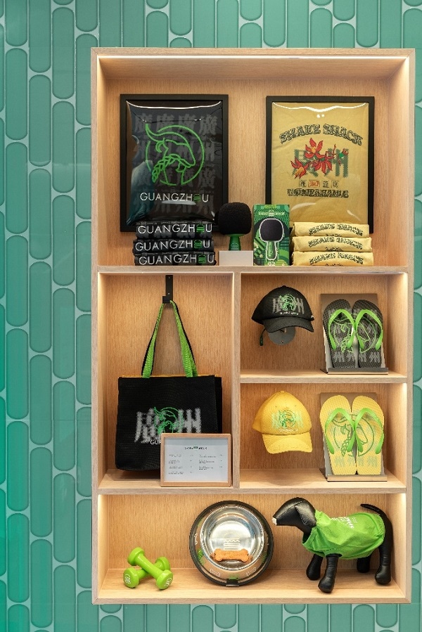 广州一侧,灵感来自广州天环的“双鱼”造型和珠江。珠江作为广州人的母亲河,水流连接Shake Shack和广州。艺术墙的主体部分添加五羊雕塑、骑楼街道和龙舟等城市符号为特色,用木棉花作为点缀,在水流上展现了Shake Shack的品牌理念“Stand for Something GoodTM”,表达了Shake Shack 的到来连接了两个活力国际都市,并始终坚持为顾客提供高品质美食。