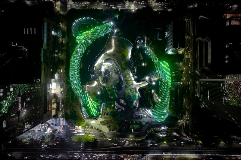 开业期间,广州天环Parc Central “双鲤鱼”建筑呈绿色
