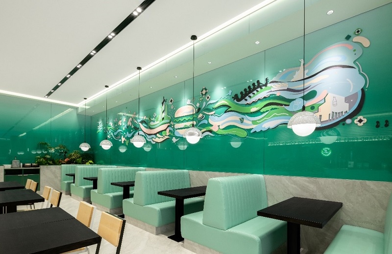 Shake Shack还与广州本地艺术家合作,为门店精心设计了一幅彰显广州与品牌文化相结合的艺术墙。艺术家通过自身多年在广州生活的洞察,灵活运用3D多维结构的艺术表达方式,以绿色和蓝色作为主色调,将门店设计和广州珠江水与纽约天鹅湖的概念融入到艺术墙中。这面艺术墙分为广州和纽约两部分,在融入广州元素的同时,保留了Shake Shack的品牌基因,是Shake Shack向广州文化和品牌理念的致敬。