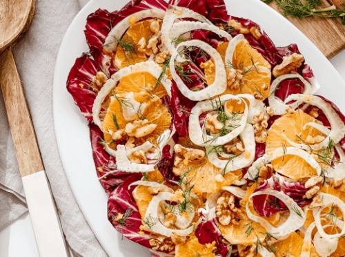 配料:2个新奇士脐橙、1个球茴香,切成薄片和茴香叶,切碎 、1头菊苣、1/2杯核桃