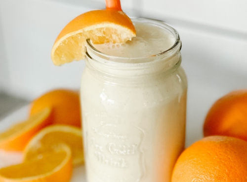 配料:1个新奇士脐橙,去皮并切成大块、1个冷冻香蕉,去皮、1汤匙香草希腊酸奶、1茶匙甜味枫糖浆(可选)、1杯杏仁奶
