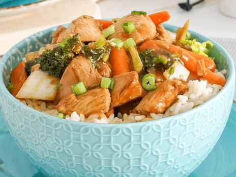 鸡肉炒菜: 3个鸡胸肉,切块、姜块切碎、1瓣大蒜切碎、1杯白菜切碎、3/4杯小胡萝卜切片、2茶匙玉米淀粉、2汤匙水、特级初榨橄榄油、1茶匙芝麻油、1个新奇士脐橙