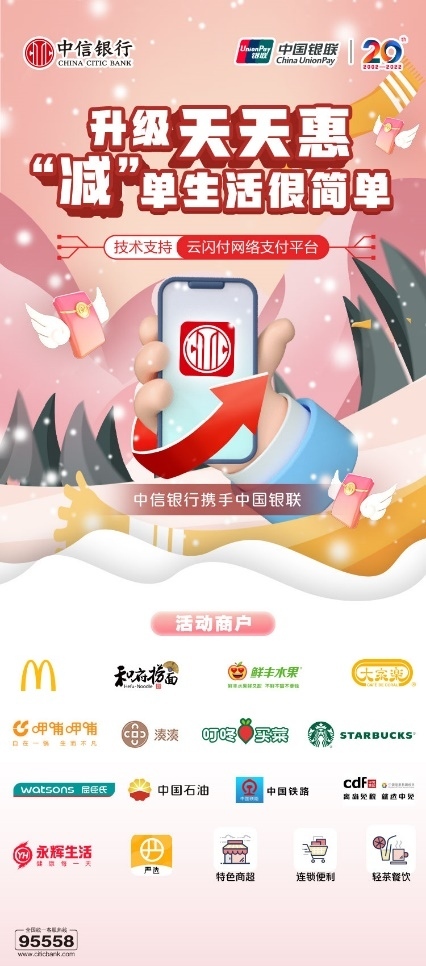 中国银联与中信银行围绕互联网、零售、餐饮、出行等用户生活场景,向中信银行APP用户推出了丰富的营销活动,包括:开通首笔支付立减10元、日常消费立减最高2022元、叮咚买菜APP满60减20元、正餐商户(呷哺呷哺、湊湊)满100减30元、轻餐商户(麦当劳、大家乐、鲜丰水果、和府捞面)满30减10元,更有屈臣氏、中石油、12306、星巴克等全国型头部商户满减活动火热开展中。