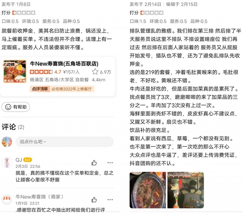 人们普遍有“损失厌恶”的心理,这个政策一出,引起了部分消费者的质疑。“牛new以前他们不收押金,现在收押金这是合理的吗?”一名消费者在社交媒体发文询问收押金是否合理。还有一些顾客在大众点评上表示对其餐前收押金感到不适,并且会催促顾客买单,虽然不违法但不合理。