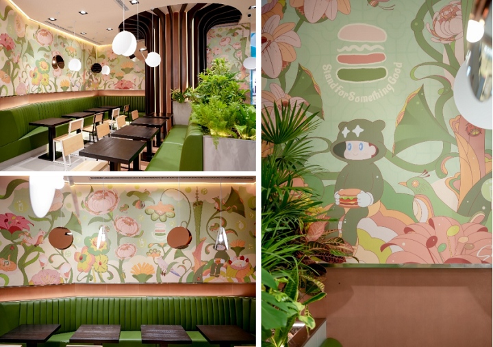 Shake Shack太古汇店以花作为设计灵感,将广州花城景观引入室内,营造独特的绿洲空间体验。店内更以广州“花城”之名为灵感打造清逸艺术墙,选取与门店氛围相符的暖色调,用汉堡花、薯条花、雪糕花、奶昔花象征门店经典美食,配合广州塔叶卷与歌唱花元素,整体融美食、自然和广州地标于一体,彰显门店特色的“音乐”叙事主题。这一富有活力的创意空间为前往门店的广州宾客们提供既“有声气”又极具生机的用餐环境。