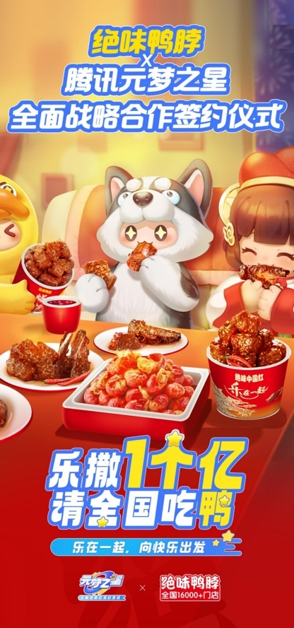 1月20日,国内休闲卤制品行业的领先品牌绝味食品正式官宣与腾讯手游《元梦之星》达成全面战略合作,双方于“绝味中国红.乐在一起主题活动-长沙站”活动现场举行签约仪式,并且“乐撒一个亿”红包雨,让用户和消费者虚拟现实场景中快乐加倍,再次在线上线下共同引爆消费热点。