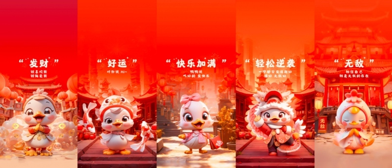 在品牌的IP设计上给予灵感,基于AI技术,生成绝味“快乐鸭”、“好运鸭”、“发财鸭”、”逆袭鸭“、”无敌鸭“IP形象,与AIGC联袂打造本次线上线下全渠道爆品营销。