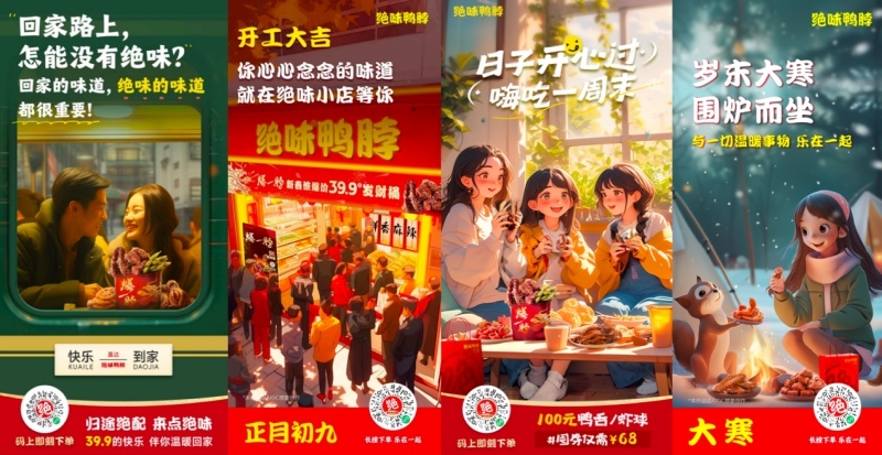 物料海报的设计也充分体现了 AI 的智能应用。绝味利用 AI 设计工具,快速生成多样化的海报创意,提高了设计效率和质量。尤其在包装设计上,更是融入了新春“龙”的元素,中国红的新春设计和发财桶完美结合。在春节期间宣传海报,利用AI高效结合不同的消费场景和不同年龄的目标受众,生成一批优质海报的风格和内容,确保海报与营销策略的高度一致性。