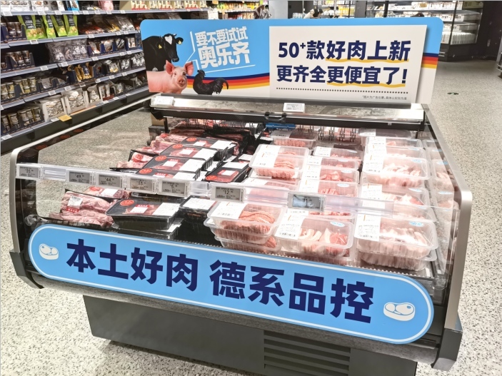 近期,我们观察到德国超市品牌奥乐齐开始加码在中国市场的生鲜业务板块发展。5月中旬,奥乐齐一次性上新了50余款生鲜产品,涵盖黑猪、牛肉、鸡肉、海鲜等多个细分类目,其中黑猪价格比之前平均下降了40%。结合奥乐齐2023年起在中国的动作来看,这是奥乐齐继续看好中国市场并加大本地化投入的策略延续。近年来,在精选客群覆盖广泛且复购率高的商品的基础上,奥乐齐又在中国陆续推出了数百款自有品牌商品,其中不乏9.9元的洁面乳及洗发水、10.7元980克的酸奶和8.9元950毫升鲜牛奶等“超值”系列产品。今年,它又发力生鲜品类。