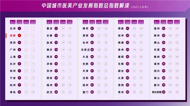 该指数涵盖人才、资本、科技、消费等多个核心维度。本次指数中除上海、北京保持稳定外,其余城市排名变动率高达96%,近三分之一城市连续上升,展现出中国医美行业整体“向上生长”的积极态势。与此同时,头部与尾部城市格局相对固化,而“腰部城市”竞争激烈,也进一步印证了医美产业在城市发展中“强者恒强”的普遍规律。在这一背景下,成都的稳步提升尤为可贵,体现出城市在激烈竞争中的战略定力与执行力。