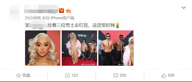 8月27日,有网友在网上晒出,某外国女星拴着三位男人走红毯,此举在网上引起热议。