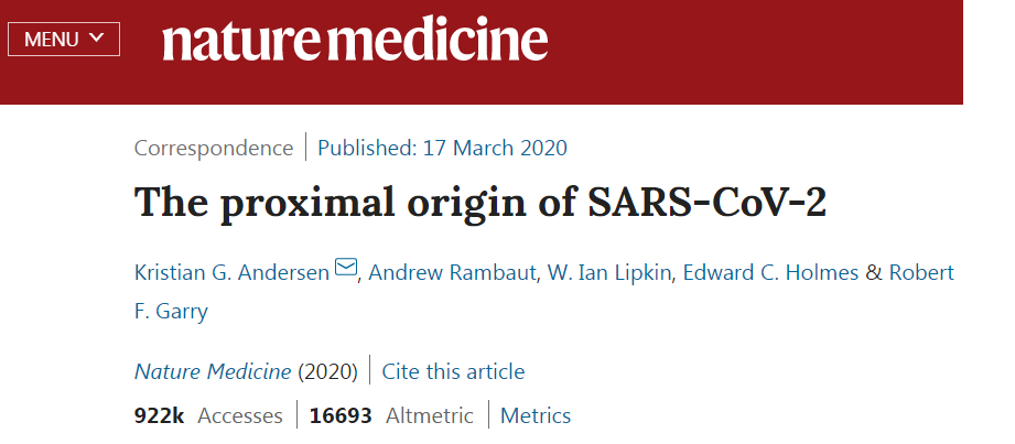 新式冠状病毒(SARS-CoV-2)究竟从哪里来?3月17日,Nature Medicine上刊发了一篇来自世界研讨团队的通讯文章,说明新冠病毒是天然进化的产品,并提出两种最有或许的来历:1)感染人之前,在动物宿主中发作了天然选择;2)从动物跳入人类后,在人际传达中发作了天然选择。