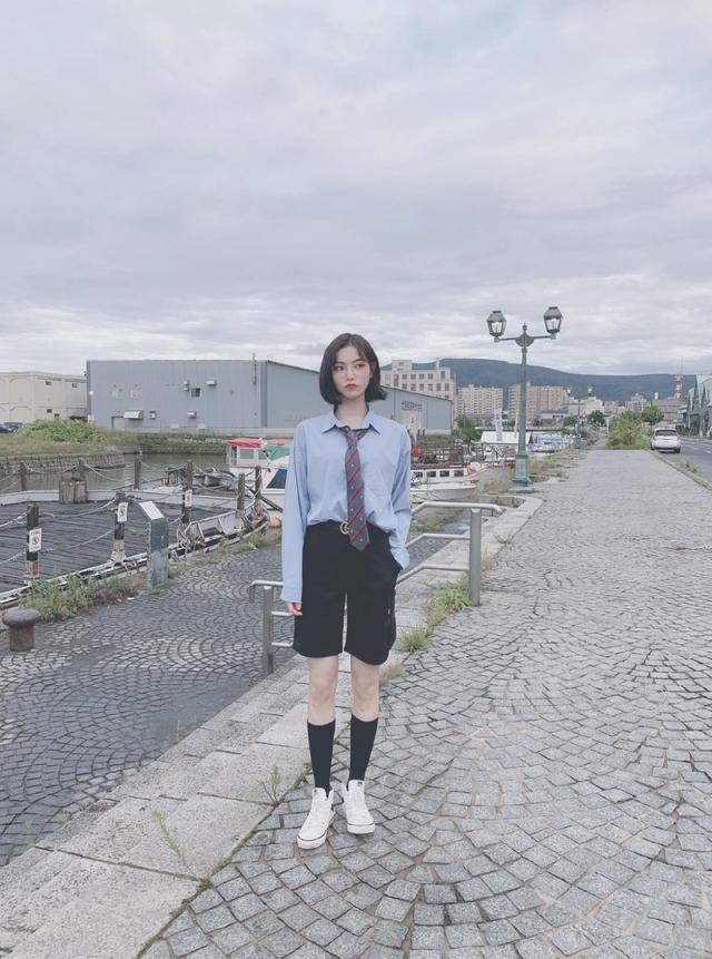 衬衫下面能够调配的单品也许多,像许佳琪的这件黑色四分裤就很不错。四分裤这种长度超级显腿瘦,上身作用飒爽又有特性,中性范儿十足。许佳琪的调配也可谓范本,黑色四分裤下面调配同色系长筒袜,色彩彼此照应,随意调配一双白色高帮板鞋,走在街上,似乎走路都带着风。