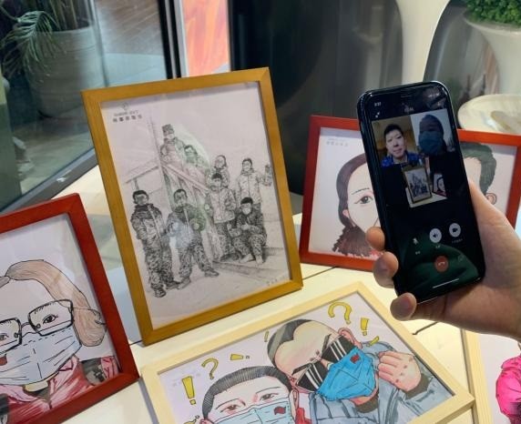 在现场观展的宁夏援湖北医疗队队员经过视频连线为搭档展现为他发明的画作。 李佩珊 摄